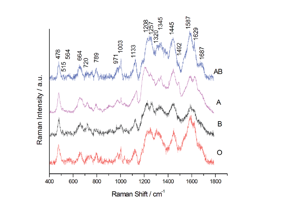 SERS spectra of RBCs of ABO blood groups recorded with 785 nm laser line.